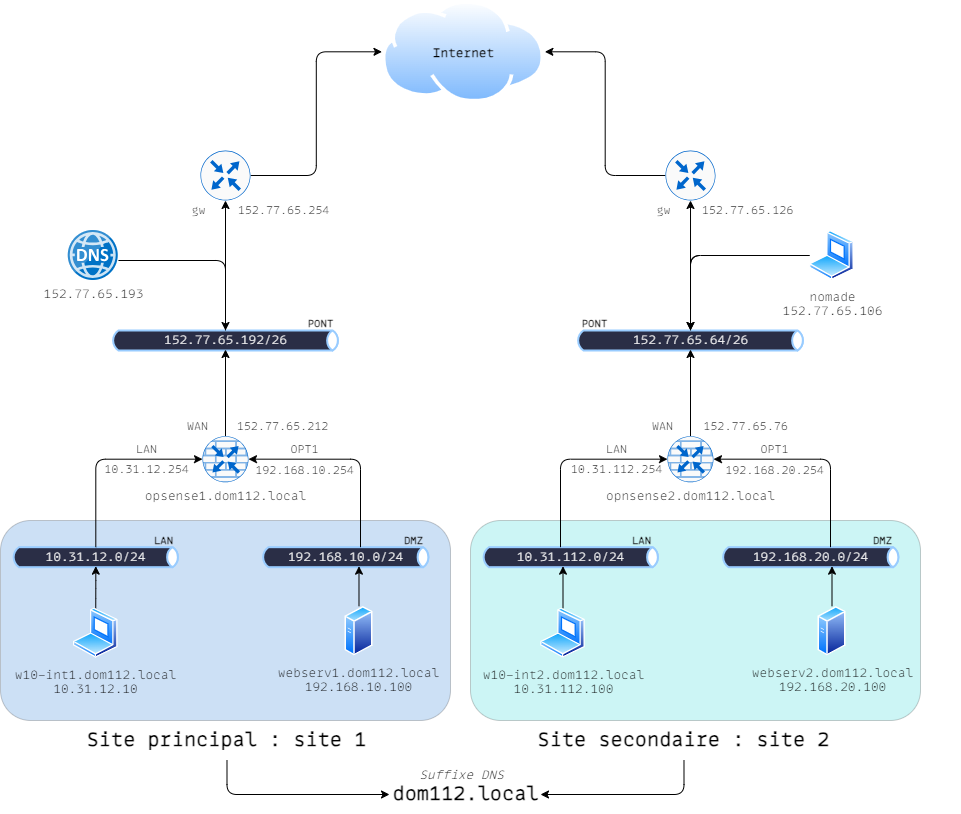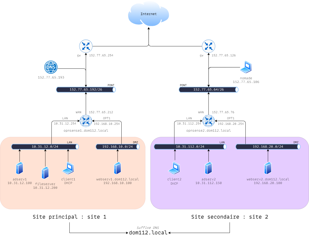 Comme le nom l'indique, nous devions simuler une situation de la vie réelle en construisant un réseau composé de 2 sites distants relié par un VPN site-à-site, chacun contenant 2 sous-réseaux avec 1 AD par sous-réseau, des machines clientes (sur lesquelles on applique des GPOs) ainsi qu'un serveur web par site, accessible via une redirection de port mise en place sur le routeur/pare-feu de sortie.